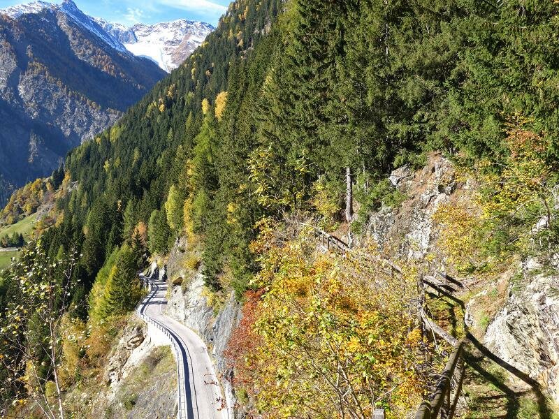 Einen fast wolkenfreien Herbsttag an den Sonnenhängen des Passeiertals erleben, das ist unser heutiges Ziel. In Walten an der Jaufenpass-Straße geht es los. Vom Ortskern aus folgen wir zuerst dem Weg Richtung St. Leonhard talabwärts (Nr. 17), dann der Nr. 9A entlang Richtung Glaiten und Stuls. Da wir früh aufbrechen, liegt der erste Abschnitt noch im Schatten. Das ändert sich, als wir uns dem Sendemasten am Eck bei Glaiten nähern: Sonne und eine super Aussicht auf das Tal.