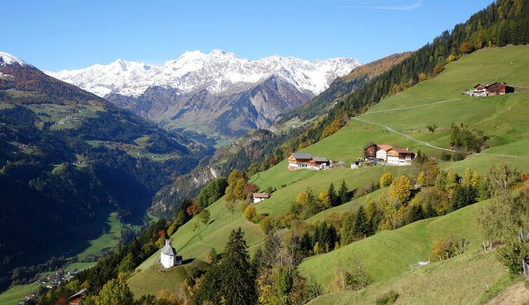 Über die herbstlichen Wiesen und Weiden geht es hinab zum Kirchlein St. Christophorus und Hippolyt. Glaiten ist eine Streusiedlung aus verschiedenen Gehöften in sonniger Lage. Die Markierung Nr. 9, abwechselnd dem asphaltierten Weg und Waldpfaden folgend, führt uns vorbei an Wasserfällen bis nach Stuls, einem größeren Dorf auf einer kleinen Terrasse über dem Tal.