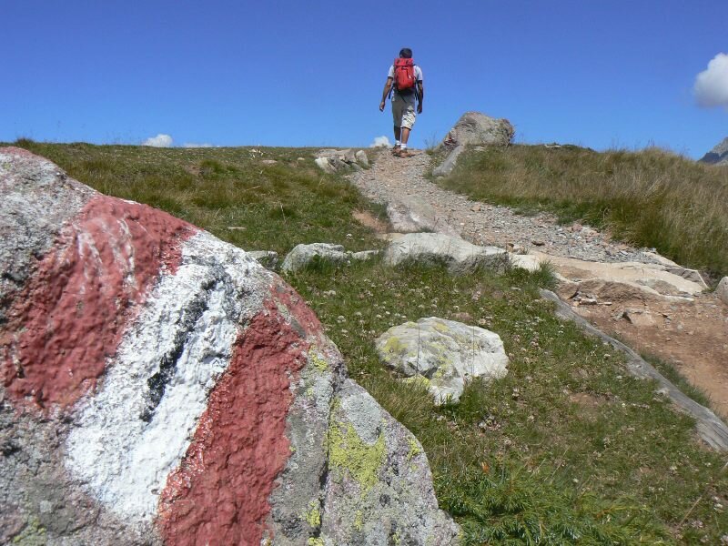 Doch noch liegt ein steiler Anstieg vor uns und wir machen uns weiter auf den Weg. Immer wieder werden wir von Kühen begleitet. Bald ist die erste Wegkreuzung erreicht. Nach rechts führt der Weg zur Meraner Hütte und links zu den Stoanernen Mandln, die nur noch etwa eine halbe Stunde Marsch entfernt sind. Wir entscheiden uns spontan dafür, nach dem Besuch der Stoanernen Mandln, unsere Wanderung bis zur Meraner Hütte fortzusetzen, da wir gut in der Zeit und wanderfreudig sind. Doch zuerst führt der Weg zu der breiten Bergkuppe, auf denen die besagten „Steinmännchen“ auf 2.003 m ü.d.M. stehen. Wir entdecken ein Wetterkreuz und sind überwältigt von der traumhaften Aussicht auf die umliegende Bergwelt.