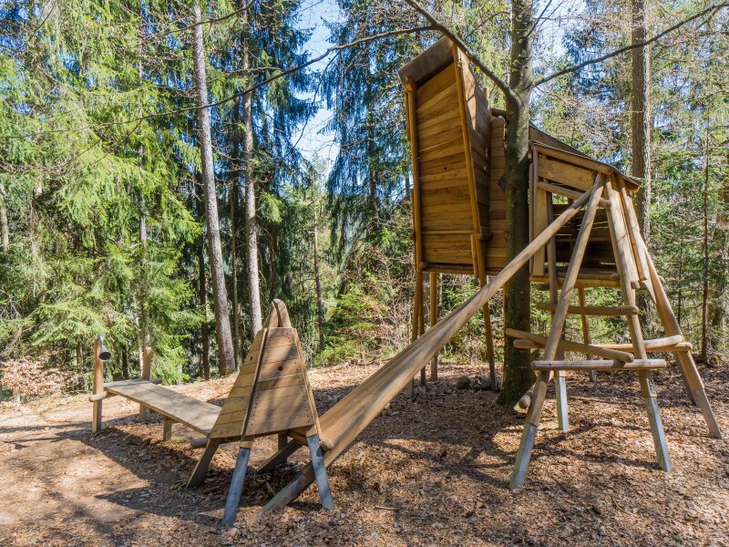 Verschiedene Stationen am Köfeleweg, einem Themenweg für Familien, laden zum Spielen, Klettern und Relaxen in der Natur ein