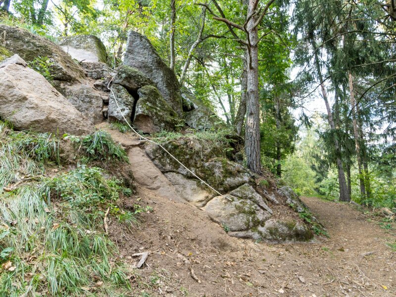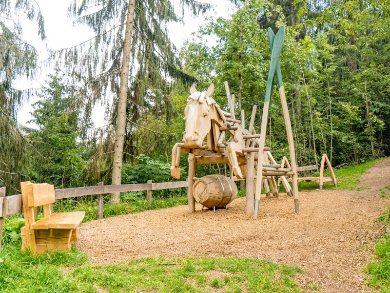 Danach sind es nur 15 Minuten, bis wir die erste Station erreichen: Das riesige hölzerne Haflinger Pferd eignet sich ideal zum Kraxeln. Sobald wir uns etwas ausgetobt haben und einige Fotos fürs Familienalbum gemacht haben, geht es weiter: Zehn Minuten und das Baumhaus mit Höranlage ist erreicht. Danach folgt nach weiteren zehn Minuten der Knottensteig mit einem Seil, um sich über die Felsen hochzuziehen. Die nächste und vierte Station kommt nach ungefähr 20 Minuten:
