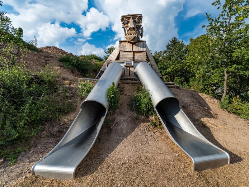 Es ist der hölzerne Riese, dessen zwei Beine Metallrutschen sind. Diese Station befindet sich in der Nähe der Seilbahn Mölten, die vom Tal hier heraufführt: Somit kannst du auch eine Seilbahn-Fahrt mit der Wanderung verbinden und bei der Station Nr. 4 einsteigen. Zeit für ein Picknick! Danach ist es für unsere heutige Wanderung nur noch eine weitere Spielstation, die uns erwartet. Die Spinne und der Salamander markieren nach weiteren 30 Minuten das Ende des Köfeleweges.