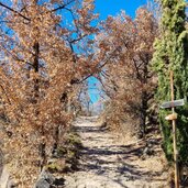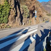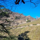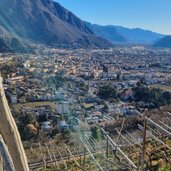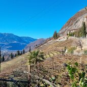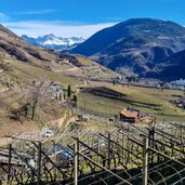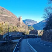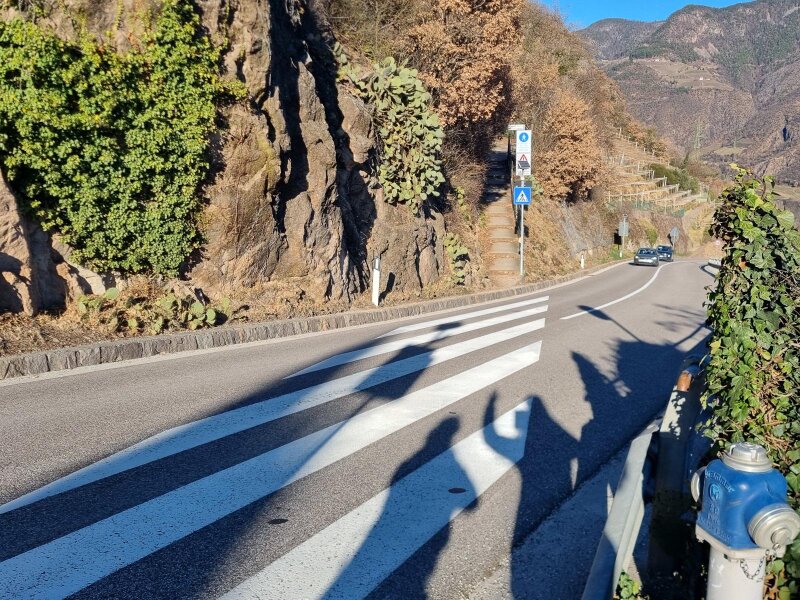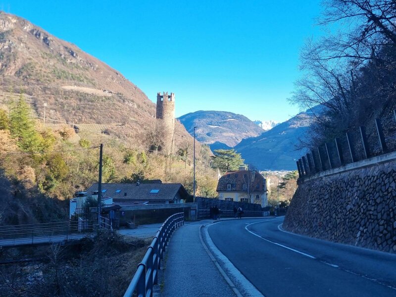 Über eine kleine Brücke erreichen wir die Hauptstraße und spazieren links zur Abzweigung mit der Jenesiener Straße, die aufwärts führt. Wir folgen ihr wenige Minuten, am Gscheibten Turm vorbei, dann folgt links der Aufstieg zur Guntschnapromenade. Treppen führen aufwärts: Durch die noch kahlen Bäume sehen wir den Wasserfall des Fagenbachs. Die Guntschnapromenade führt uns aufwärts und quert einmal die Hauptstraße. Danach schlängelt sie sich über eine Stunde sanft den Hang hinunter bis zur Wandelhalle in Gries. Die Ausblicke auf Bozen sind beeindruckend.