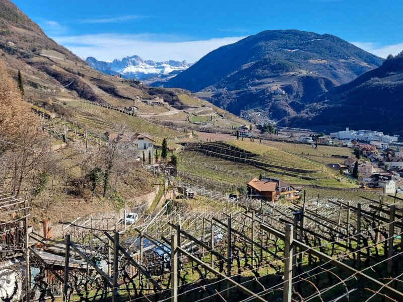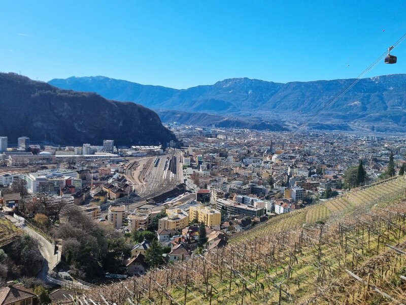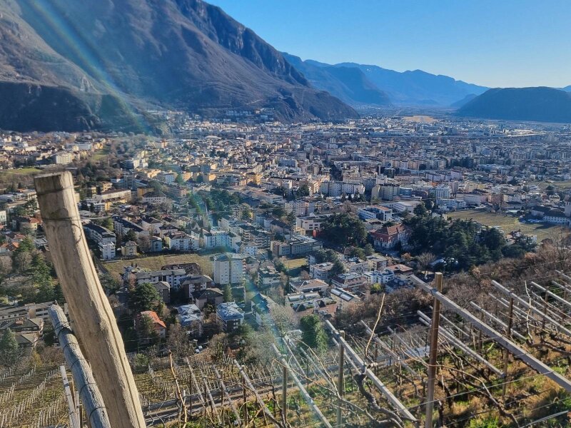 Eigentlich hat der meteorologische Frühling noch gar nicht begonnen, aber im Etschtal hält er dank des mediterranen Klimas früher Einzug und lädt schon an milden Spätwintertagen zum Aufenthalt im Freien ein. Auch im Frühlingstal in der Nachbargemeinde Eppan strecken die Schneeglöckchen bereits ihre Köpfchen aus der Erde. Vor ein paar Tagen hat es aufgrund eines Tiefs noch bis in tiefe Lagen geschneit, heute ist davon nichts mehr zu spüren. Wir starten unsere Wanderung am zentralen Waltherplatz in Bozen, fünf Minuten vom Zugbahnhof entfernt.
