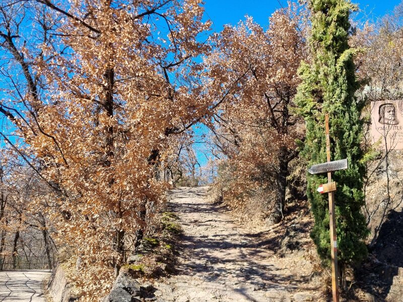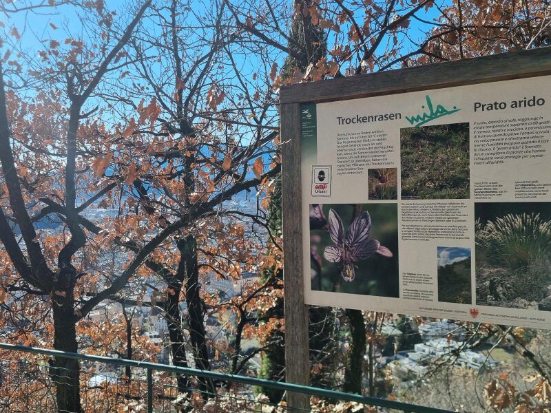 Entlang der einstündigen Wanderung, die flach den Hang entlang verläuft, genießen wir die herrlichen Panoramablicke über die Stadt, die Dolomiten und das Etschtal. Die ersten Blumen blühen am Hang. Gegen Ende hin kommen wir an der Gedenktafel von Karl von Ritter vorbei, der die Promenade geplant und erbaut hat. Danach geht es in Serpentinen abwärts nach St. Anton, dem Stadtteil von Bozen am Ende der Talferwiesen nahe Runkelstein, am Eingang zum Sarntal.
