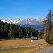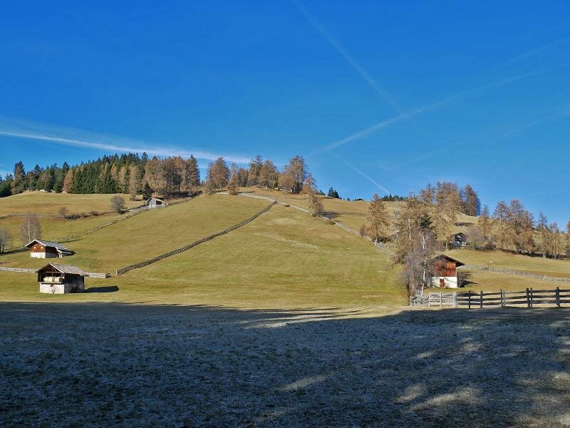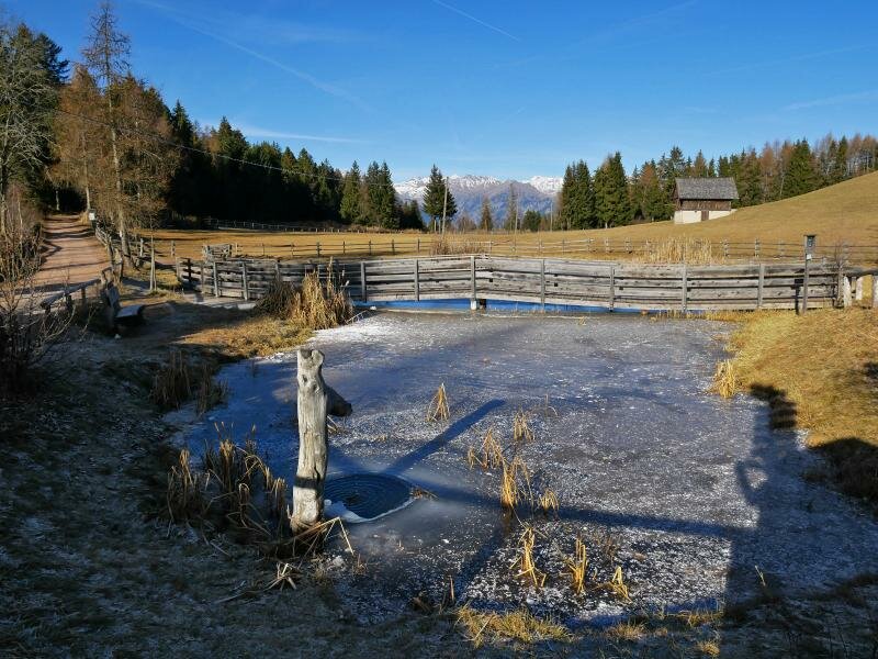 Das sonnig gelegene Vöran am Hochland über dem Etschtal ist Ausgangspunkt dieser Wanderung, welche wir zu Adventbeginn unternehmen, die aber das ganze Jahr über attraktiv ist. Von der Bergstation der Seilbahn am Dorfrand aus geht es durch das Zentrum und dann am Weg Nr. 16 hinauf zum Grünen Baum und am Waldrand weiter zu den Pichler Wiesen. Wir folgen dem Weg bis zur Kreuzung bei der Bruggn Lacke, einem Teich, der in der kalten Jahreszeit zugefroren ist.