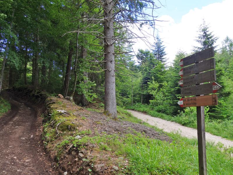 Der Saumpfad durch den Wald verbindet Truden im Mühlental mit Altrei, der einzigen zu Südtirol gehörende Gemeinde im Fleimstal. Unsere Wanderung, die wir zu einer Rundtour erweitert haben, beginnt am Parkplatz oberhalb des Dorfes Truden. Wir folgen dem Wegweiser Nr. 8, der uns zuerst zum Rundweg Forchwald führt, dem Trudner Sagenweg. Dieser Weg mündet bei einem Weiher in die Forststraße zum Rungganö-Kreuz. Wir folgen dieser bergauf (Markierung Nr. 5), vorbei an blühenden Wiesen, bis wir zur Kreuzung am Beginn des Waldes kommen.