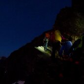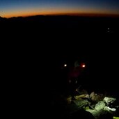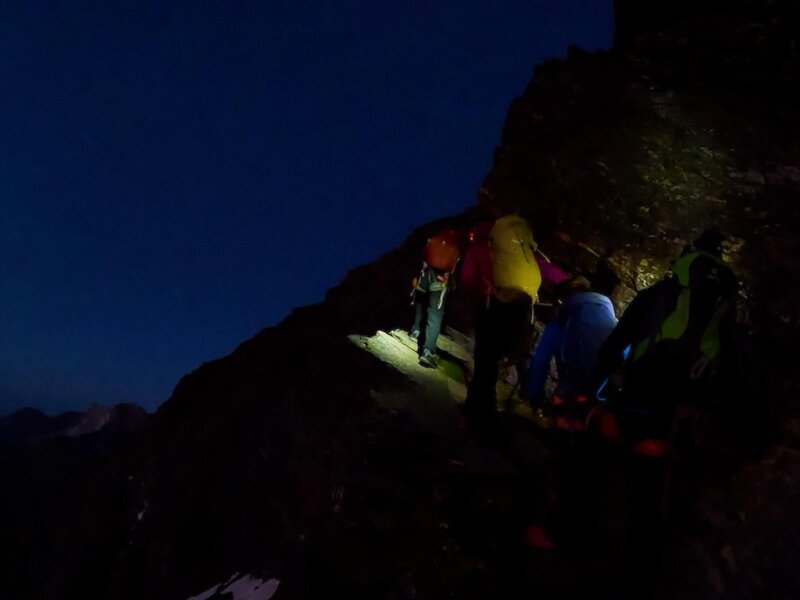 Am nächsten Morgen starten wir noch im Dunkeln. Der Weg führt über einen breiten Sattel zum Ostgrat, dann über eine teilweise grasige Südflanke und einen gesicherten Abschnitt weiter zum Grat, bis wir eine Steintreppe erreichen. Sie führt uns in eine schmale Scharte hinab - die engste Passage mit steilem Abbruchgelände zu beiden Seiten. Nun erwartet uns der Kletterabschnitt, der uns auf den Gipfel des Hinteren Seelenkogels bringt. Oben auf 3.472 Meter belohnt uns der Aufstieg mit einem fantastischen 360°-Panorama über die Ötztaler Alpen.