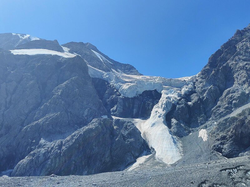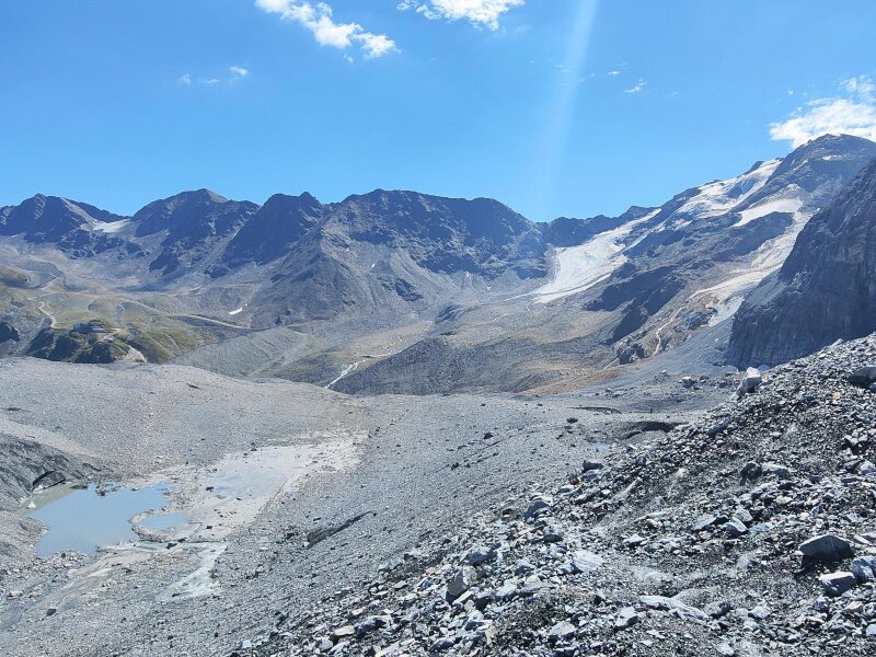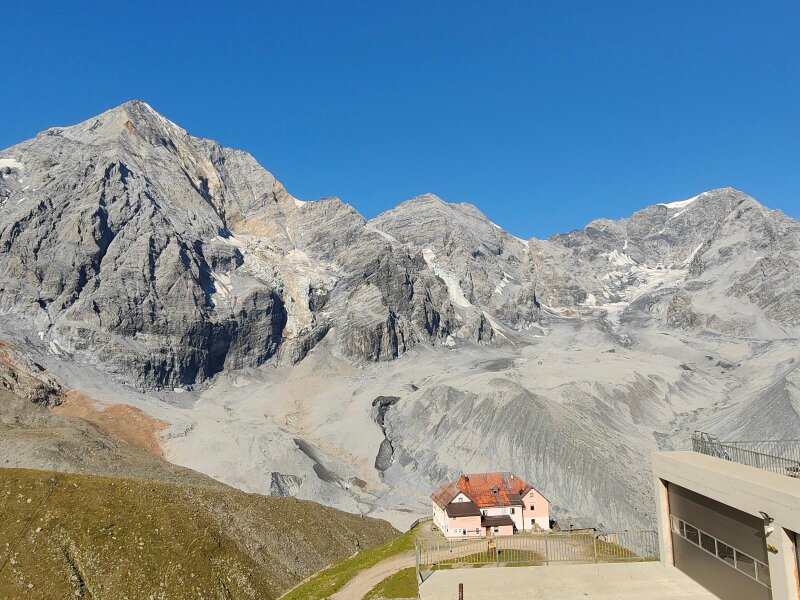 Mit der Seilbahn Sulden erreichen wir die Bergstation und die Schaubachhütte (Stand 2026: aktuell geschlossen, da sie zum Verkauf steht). Von hier aus folgen wir den orang-gelb markierten Holzpfählen, die uns den Gletscherweg zeigen. Sie dienen deshalb als Markierung, da die Gletscher ständig in Bewegung sind - jedes Jahr wird die Strecke neu angelegt. Ein interessantes Terrain, in dem wir uns heute bewegen - die Ausblicke an diesem sonnigen Augusttag sind herrlich!
