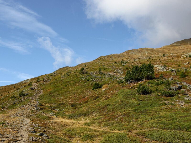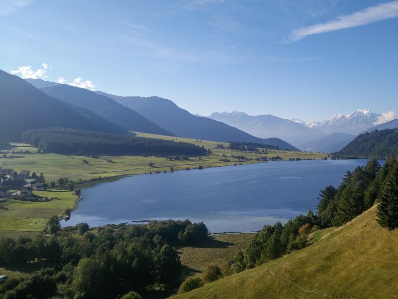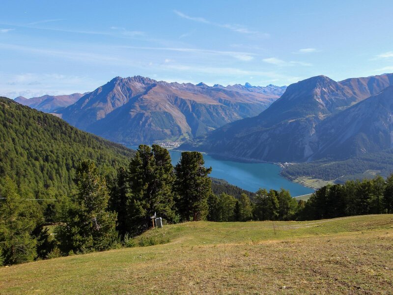 Noch präsentiert sich die Alm in ihrer sommerlichen Naturschönheit mit Panoramablick auf das Vinschau mit dem Reschensee und dem Haidersee. Wir schlagen den Weg Nr. 16 ein, der bei der Bergstation aufwärts führt. Die ersten fünf bis zehn Minuten ist es eine Forstraße, danach biegt der Weg rechts ab (immer Nr. 16) und folgt der Skipiste aufwärts bis zu einem kleinen Sattel. Danach geht es leicht abwärts und danach aufwärts zum Grünsee. Wir erreichen ihn nach einer Stunde Gehzeit. Es gibt übrigens mehrere Grünseen im Westen Südtirols, darunter einen im Ultental und einen in Martelltal, die aber beide nichts mit unserem Grünsee zu tun haben.