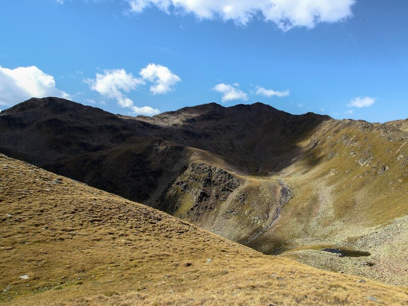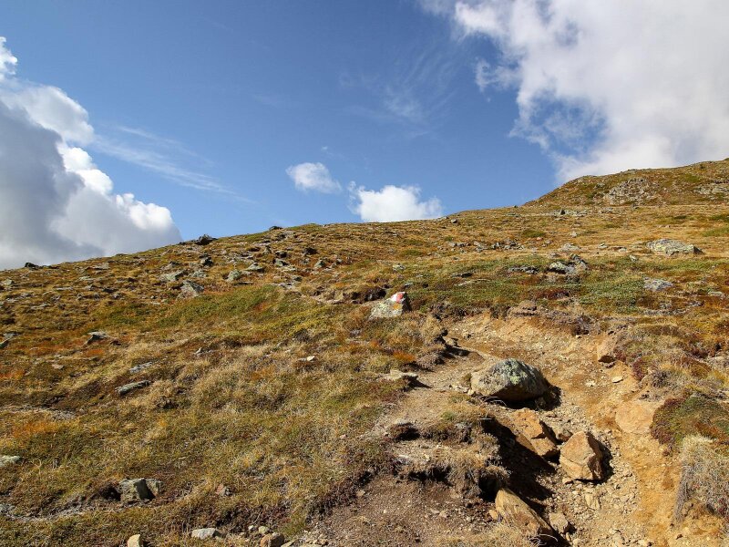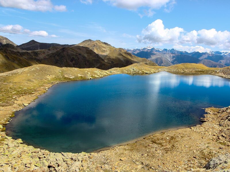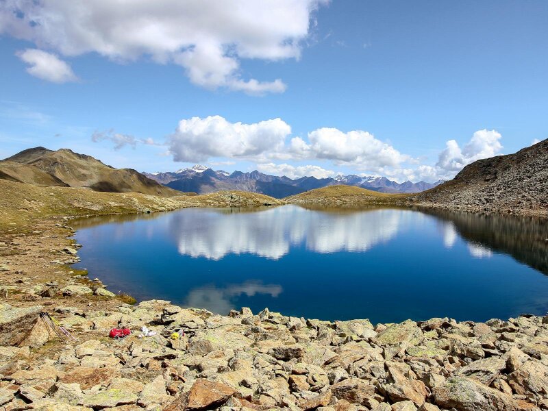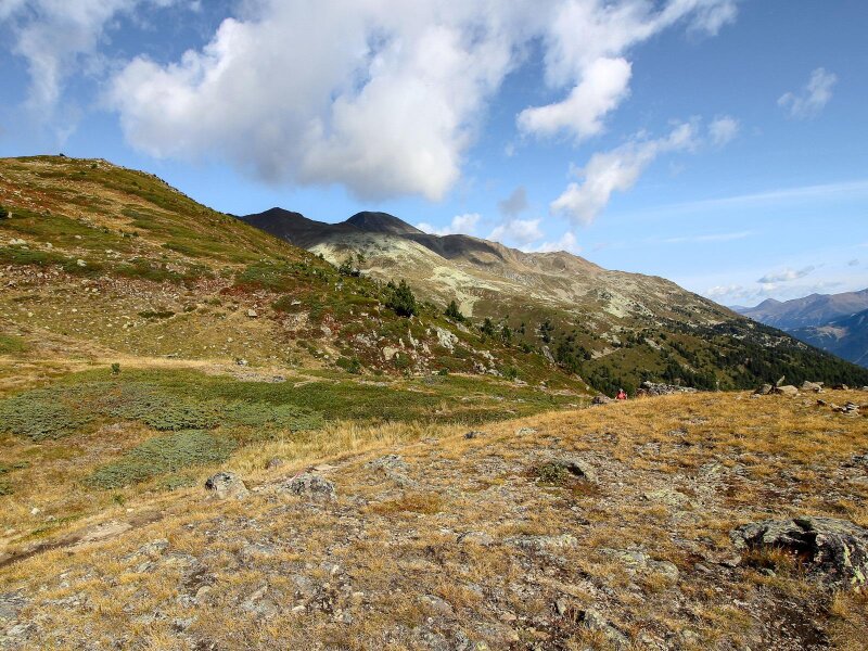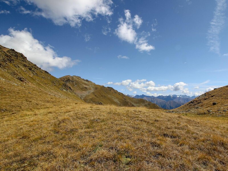 Wir suchen vergeblich nach Wegweisern zum Rasass-See und wandern weiter Richtung Westen, teilweise ohne erkennbaren Wanderweg. Wir folgen den Spuren der Hirten und bleiben immer auf derselben Höhe. Danach geht es aufwärts zu einem Sattel und dann in Auf-und-Ab zum Rasaß-See unterhalb der Rasaß-Spitze. Wir sind auf 2.700 Meter Seehöhe, nach Osten öffnet sich der Blick auf die spektakuläre Bergwelt der Ötztaler Alpen. Wir selbst befinden uns im Sesvenna-Gebiet.