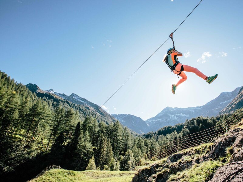 Zwischen Lärchen, die sich im Herbst bunt verfärben, und friedlichen Bergwiesen, spannen sich Plattformen und Kletterseile bis die Baumwipfel. In einem kleinen Wald beim Bergdorf Pfelders im Passeiertal wurde der neue Hochseilgarten SpiderPark angelegt, der seine Besucher bis in 40 Meter Höhe hinaufbringt. Rundherum ragen die Dreitausender der Ötztaler Alpen in den Himmel.
