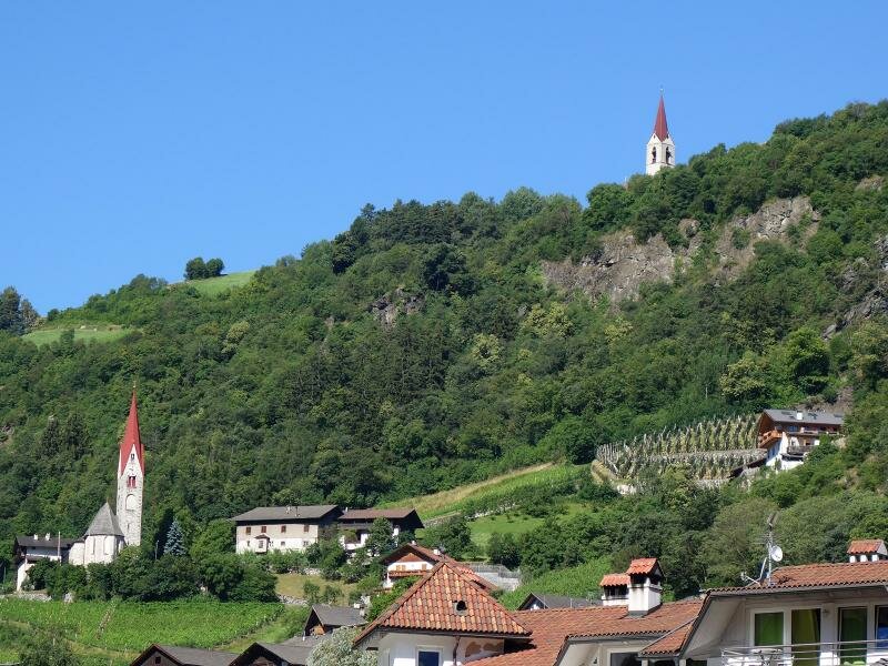 Das Latzfonser Kreuz mit Kirche und Schutzhaus auf 2.300 m Höhe ist ein beliebtes Ausflugsziel in den Sarntaler Alpen. Das Ensemble, die hochalpine Landschaft oberhalb der Baumgrenze und die Sicht zu den Dolomiten sind Grund genug, den Aufstieg auch mit dem Mountainbike zu wagen. Unsere Tour beginnen wir ganz unten im Talboden südlich von Brixen, bei der Sportanlage unterhalb von Schrambach. Frühmorgens, bevor die Hitze das Tal aufheizt, geht es durch die Weinlandschaft an Schrambach vorbei hinauf nach Feldthurns Dorf und weiter nach Latzfons.