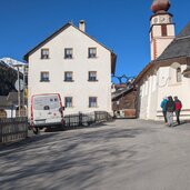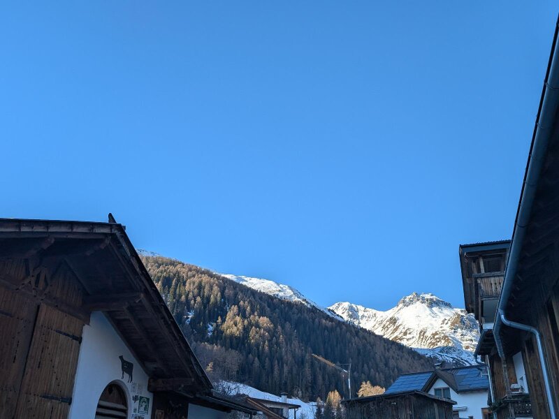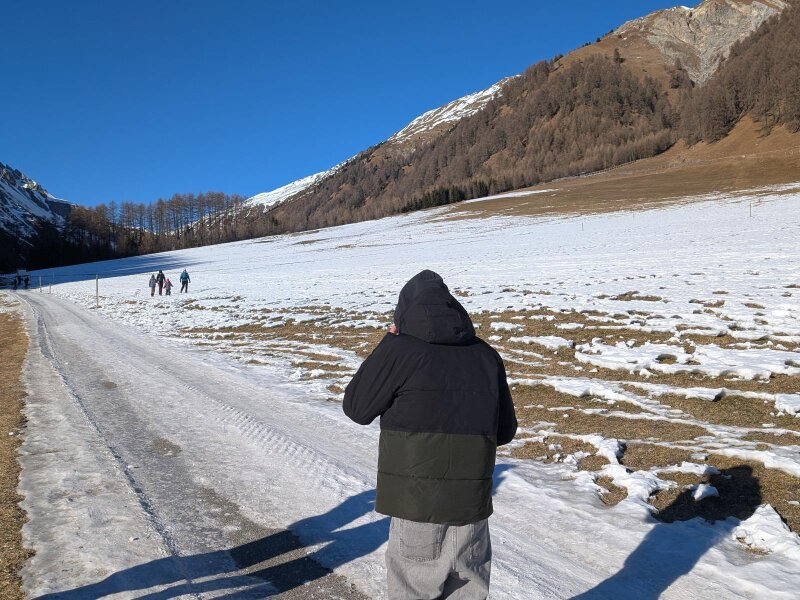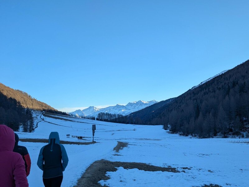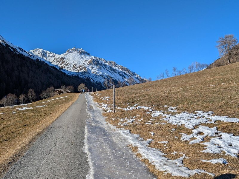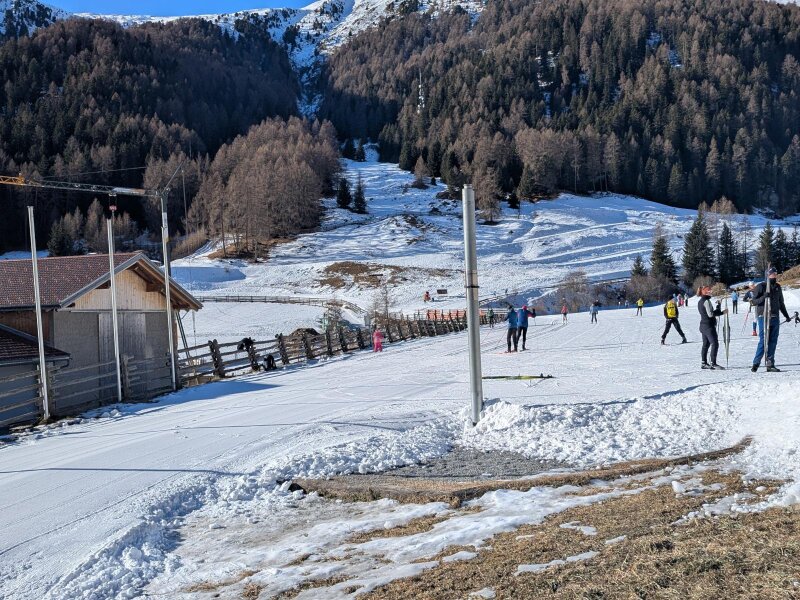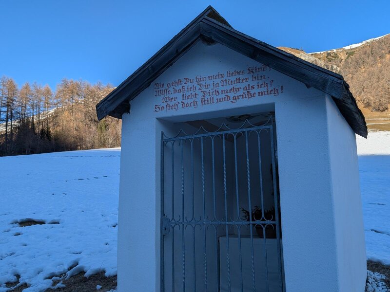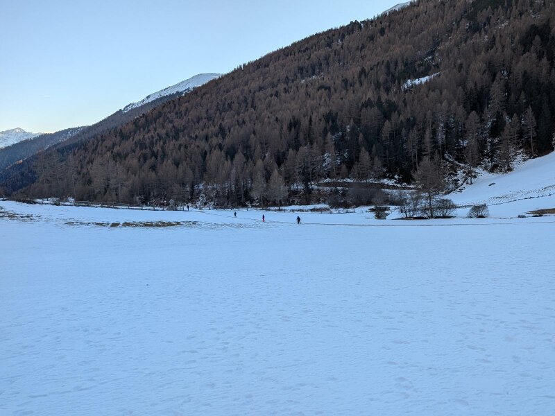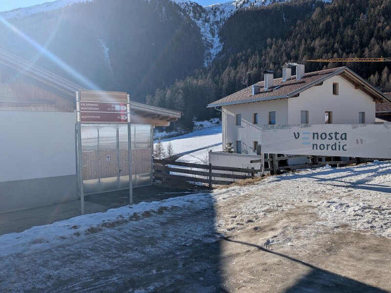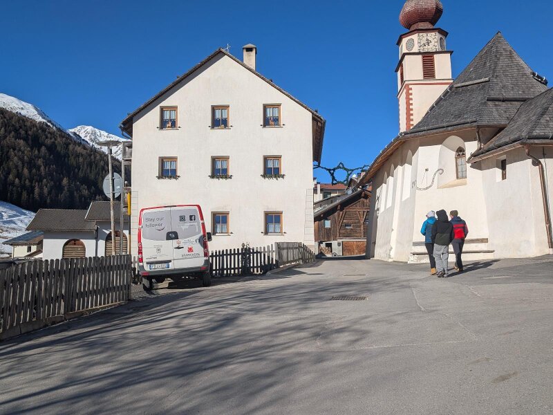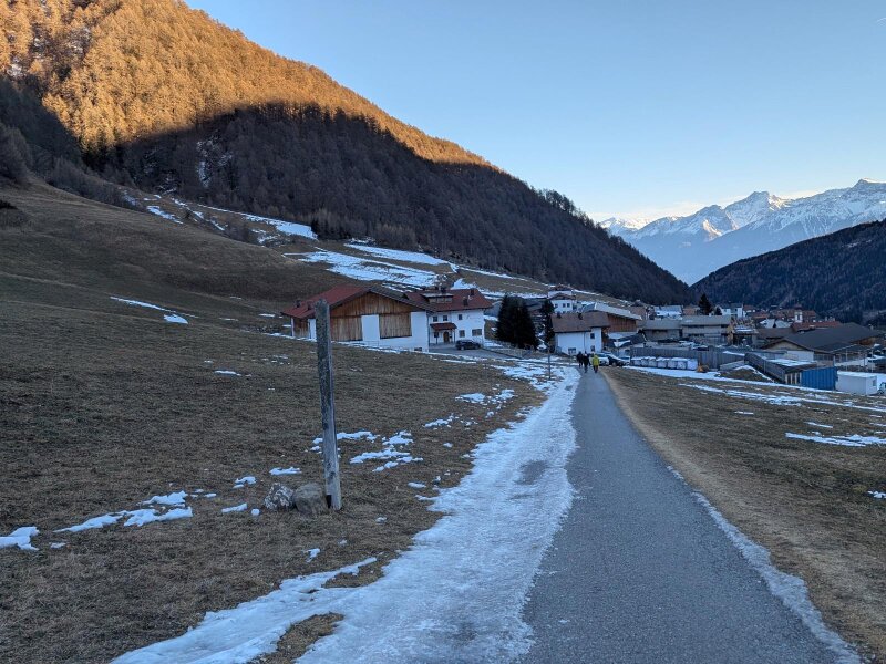Es ist ein Januartag mit idealem Wetter für eine leichte Wanderung im Vinschgau. In Schlinig gibt es mehrere Parkplätze und der Ort ist auch mit der Buslinie 277 leicht erreichbar. Wir starten im Ortszentrum und wandern leicht aufwärts durch das Dorf. Nach der Kirche zum Heiligen Antonius und den letzten Häusern lassen wir auch das Langlauf Nordic Center Schlinig hinter uns.