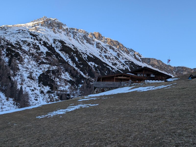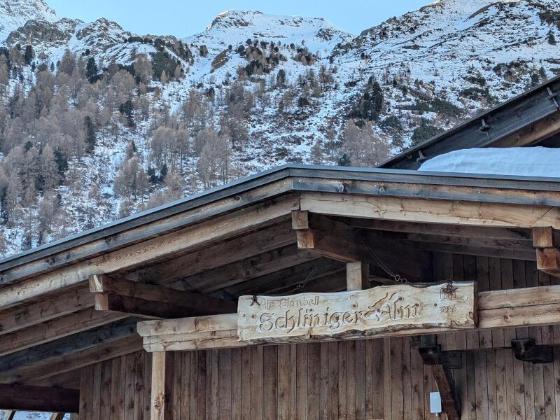 Er ist jetzt im Januar komplett zugefroren. Nach etwas mehr als einer Stunde gemütlicher Wanderung mit Plaudern in der Gruppe erreichen wir die Schliniger Alm auf über 1.800 Meter Höhe, die auch im Winter geöffnet hat. Die Almhütte lädt von Ende Dezember bis zum Frühlingsbeginn mit regionalen Köstlichkeiten und Produkten aus der hauseigenen Käserei zu einer Einkehr ein: Hier kannst du einen der besten Almkäse des Obervinschgaus genießen.