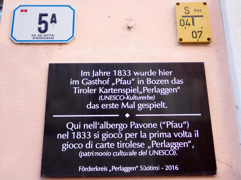 Perlaggen, das Spiel, das mit 33 Spielkarten immer zwei gegen zwei gespielt wird, zählt mittlerweile zum Immateriellen Kulturerbe. Sein Ursprung liegt im Südtiroler Etsch- und Eisacktal, wobei in der Bindergasse in der Bozner Altstadt immer noch eine Tafel an einem Haus an dessen Entstehen erinnert. Laut der Inschrift wurde im Jahr 1833 im Gasthof Pfau das erste Mal Perlaggen gespielt.