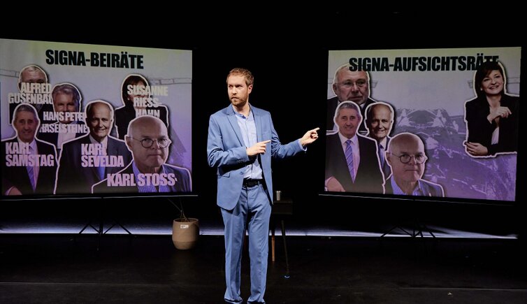 Nach Stücken wie „Die Redaktion“ oder „Heldenplätze“ blickt der Autor und Regisseur Calle Fuhr gemeinsam mit der investigativen Redaktion DOSSIER erneut hinter die Schlagzeilen, um den Aufstieg und Fall des Wunder-Wuzzis Benko zu erzählen. Calle Fuhr steht in diesem Solo selbst auf der Bühne, nimmt das Publikum mit auf die Reise ins erstaunliche Signa-Wunderland und zeigt das System, das einen René Benko erst ermöglichte. „Spannend bleibt es über die gesamte Dauer der Vorführung. Ein Aha-Erlebnis folgt dem anderen.“ (ORF, ZIB 13) Die umjubelte Uraufführung des Wiener Volkstheaters, die auch zum Festival „Radikal jung“ eingeladen war, wird am Schauspiel Köln in aktualisierter Version weitergeführt, wo Kai Voges als Intendant und Calle Fuhr als Hausautor und Regisseur ab der Spielzeit 2025/26 tätig sind.