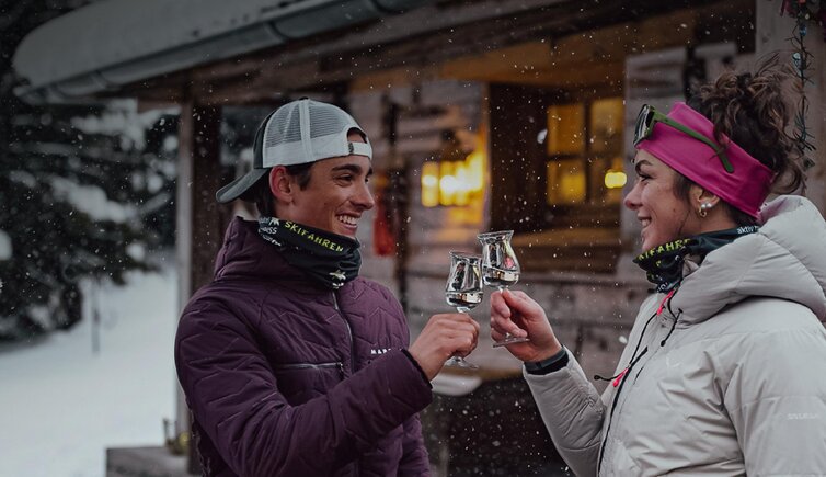 Der Hüttenabend bietet die perfekte Gelegenheit, den Tag in geselliger Runde mit Freunden oder Familie ausklingen zu lassen – umgeben von knisterndem Kaminfeuer, köstlichem Essen und einem atemberaubenden Blick auf die verschneite Bergwelt des Reschenpasses.