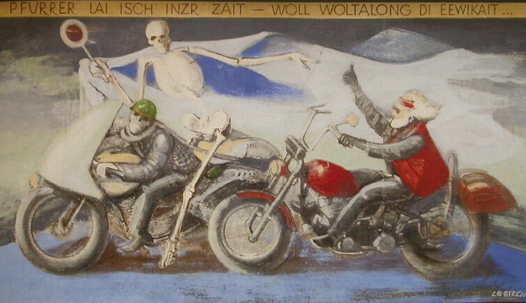 „Holt oun, a Wailele, blaib stian, nor woasch vilaicht wia waitrgian“. Dies ist einer der 18 Sprüche auf den Bildtafeln des „Plauser Totentanzes“ an der Friedhofsmauer in Plaus. Der Künstler Luis Stefan Stecher bringt in diesem kleinen „Vinschger Welttheater“ die Korrner von damals, andere Persönlichkeiten, die Vinschger Traditionen und den Vinschger Dialekt zum Ausdruck.