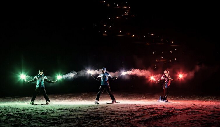 Die Skilehrer bilden zusammen mit den Gästen eine spektakuläre Lichtschlange mit ihren Fackeln, um allen ein gutes neues Jahr zu wünschen.