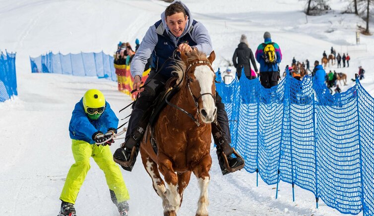 Beim Skijöring werden Skifahrer von Pferden über eine präparierte Strecke gezogen und liefern sich spannende Rennen.