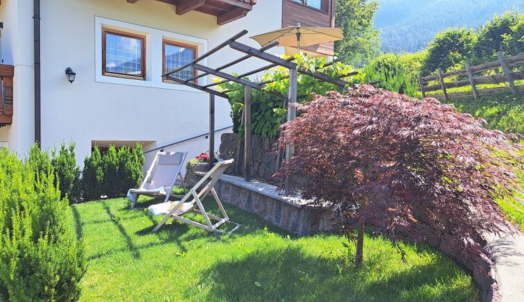 Im gepflegten Außenbereich laden Liegestühle, eine Sitzgarnitur und eine Hängeschaukel zum Entspannen ein.