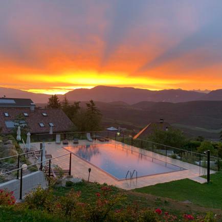 Entspannen Sie im Spa- und Wellnessbereich mit Sauna und Whirlpool oder am großen Pool im Außenbereich. Im Ruheraum verwöhnt Sie eine herrliche Aussicht auf das Südtiroler Unterland und die umliegenden Berge.