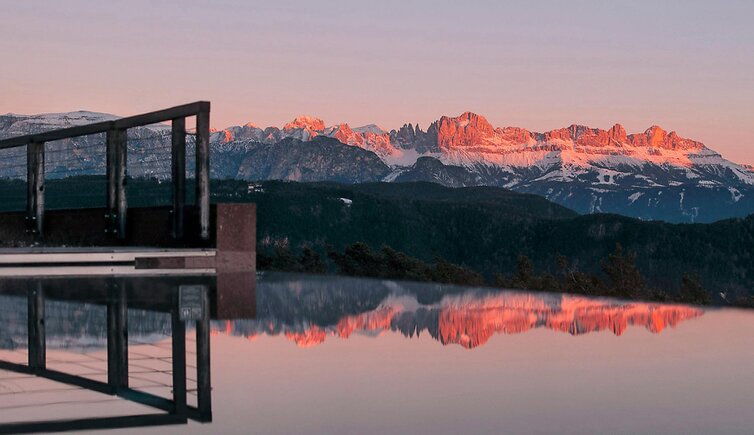 Der Blick schweift vom Schlern über den Rosengarten bis hinunter ins mediterrane Überetsch.