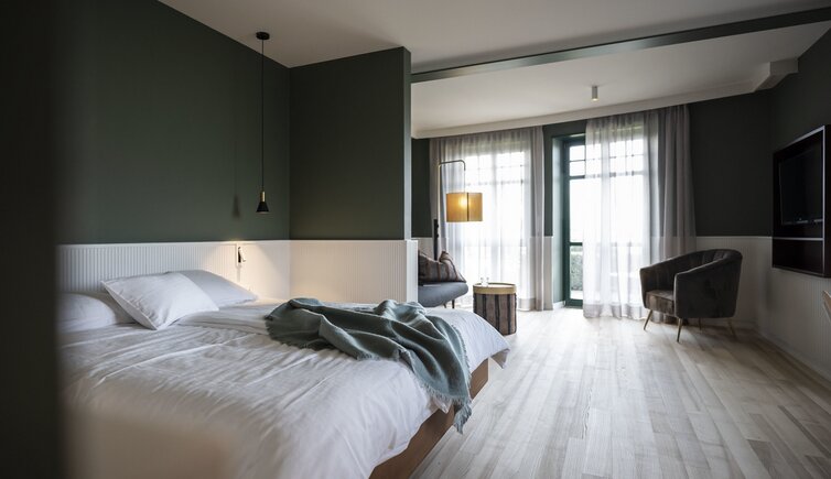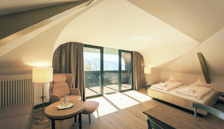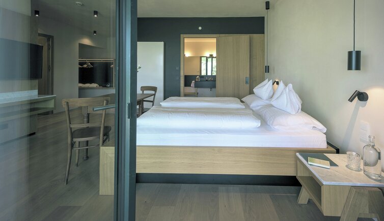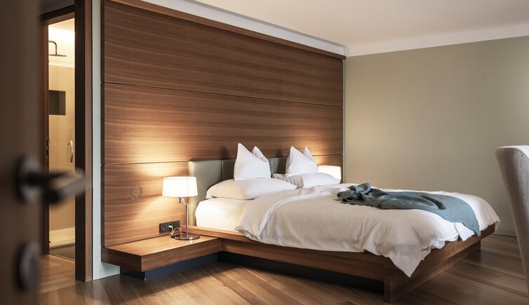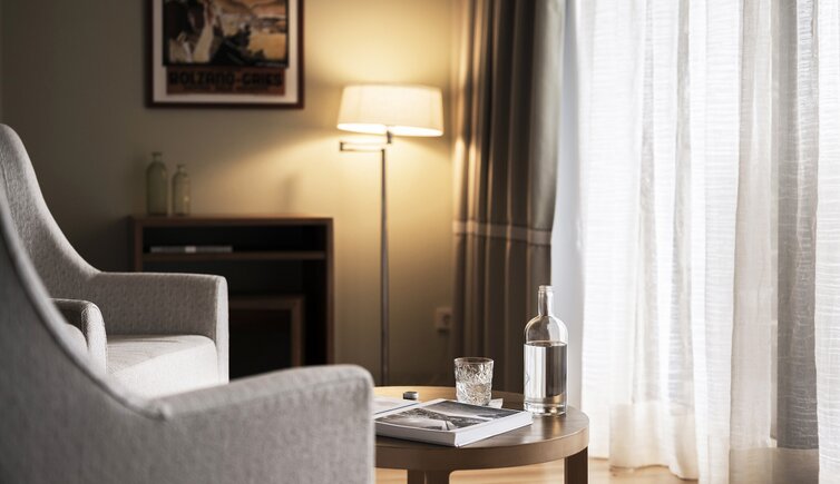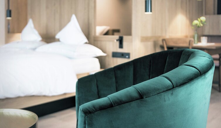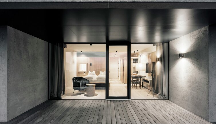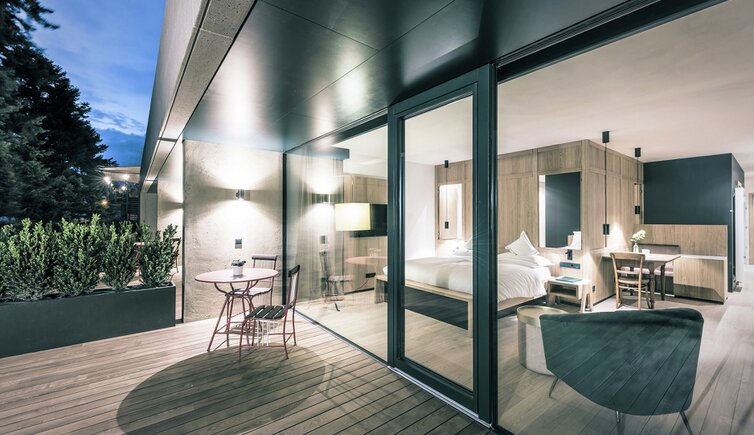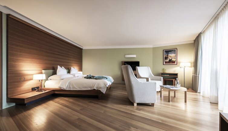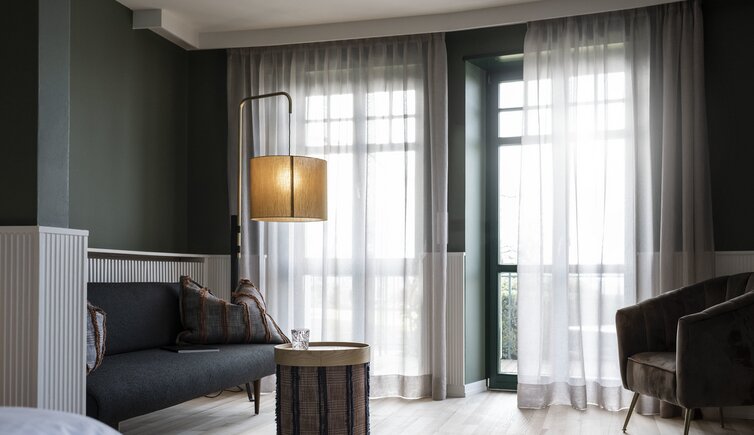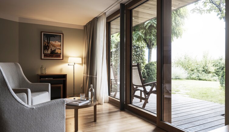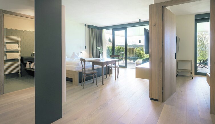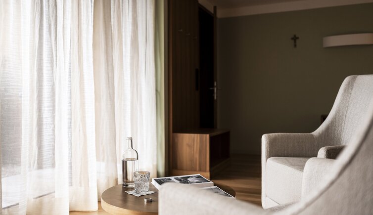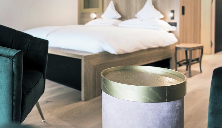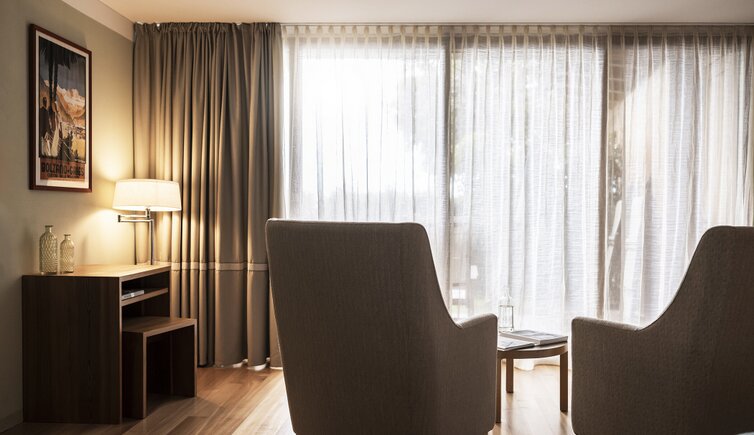 Ebenso einmalig sind die neuen, modern ausgestatteten Zimmer im Erdgeschoss mit eigenen Gärtchen, die Junior-Suiten im Park, die ungeheure Intimität und Ruhe versprechen, die Vajolet-Suiten im Penthouse und die neue Schlern-Suite.