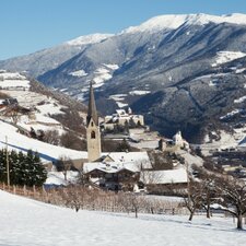 Von Klausen aus gelangst du über einige Serpentinen hinauf in das Bergdorf oberhalb des Eisacktals. Entlang der Straße siehst du die einschiffige Valentinskirche mit ihrem seitlichen Spitzturm. Bereits 1303 erwähnt, brannte sie ein Jahrhundert später ab. Beim Wiederaufbau erhielt sie das gotische Sterngewölbe, das noch heute bewundert werden kann.