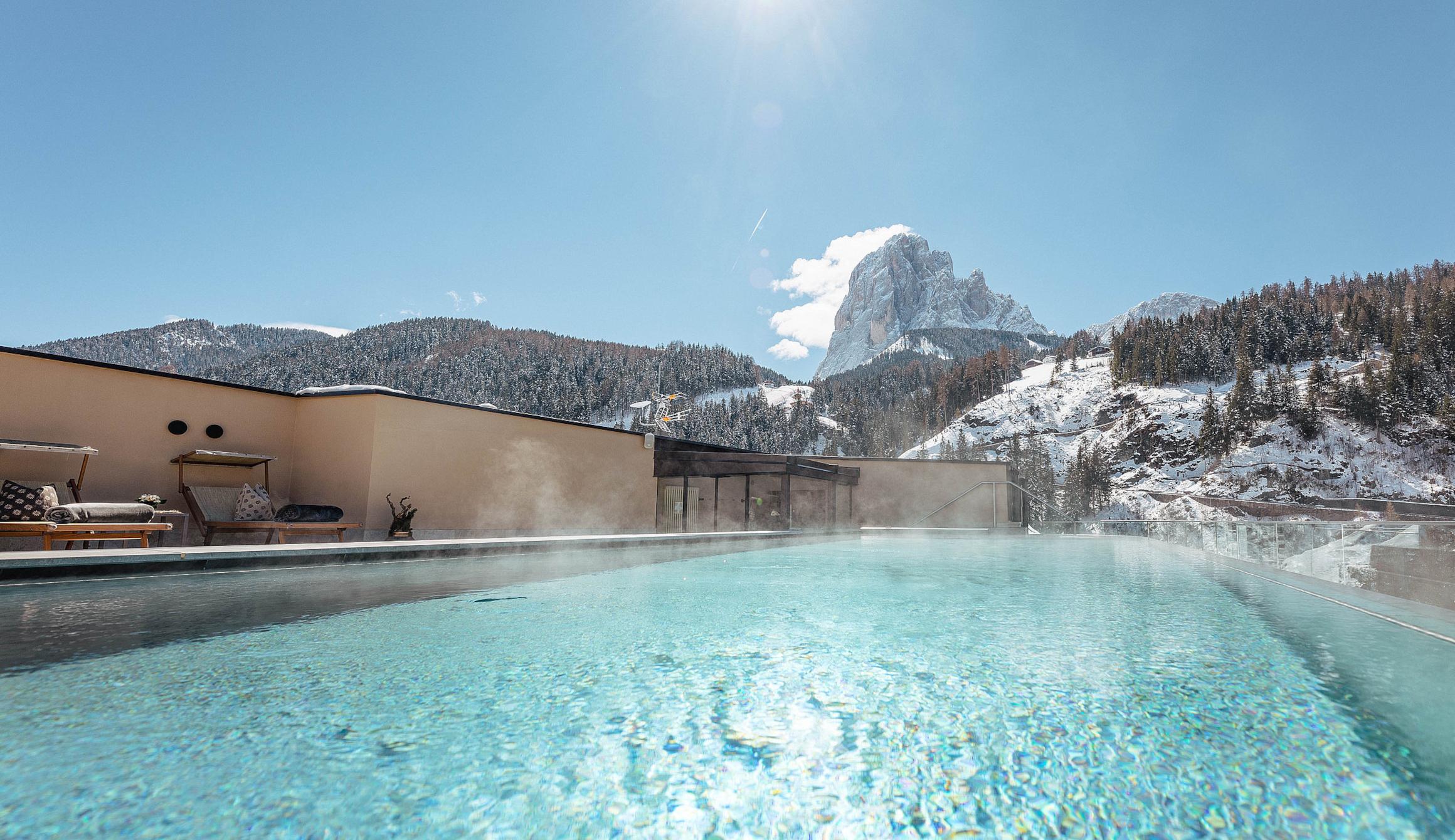 Der Wellness- und Relax-Bereich besticht durch seinen traumhaften Panoramablick über den Langkofel und St.Christina sei es aus der Sauna, dem Ruheraum oder dem Infinity Pool auf dem Dach des Hotels.