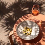 Abends Muchele-Diner mit bunten Salaten vom Buffet und Südtiroler Qualitätsprodukten, serviert im stilvollen Speisesaal oder auf der mediterranen Terrasse (ab Mai)