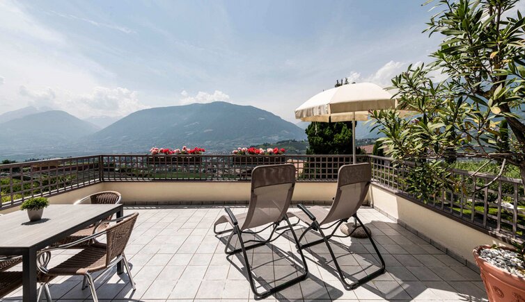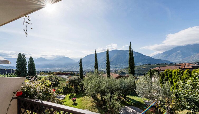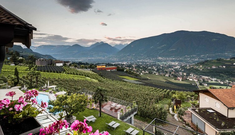 Südliches Flair, mediterrane Ruheoasen, das Panoramafreibad, der beheizte Whirlpool im Freien, die sonnige Lage mit weitem Panoramablick inmitten von Wein- und Obstgärten und umgeben von der eindrucksvollen Kulisse der Meraner Berge:
