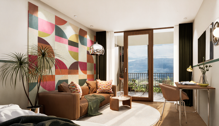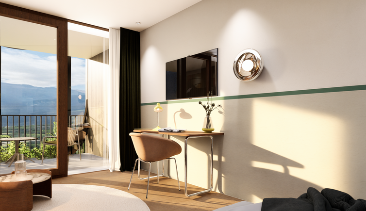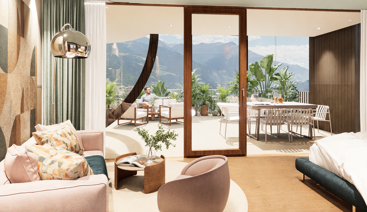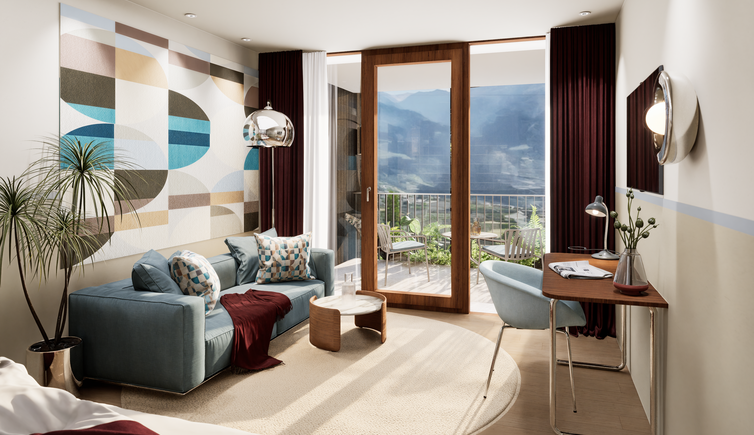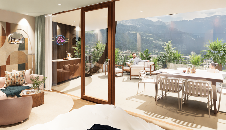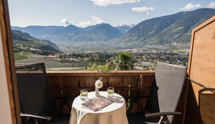 Auf der Panoramaterrasse genießen Sie einen bezaubernden Ausblick über die Stadt Meran und auf die majestätische Bergwelt.