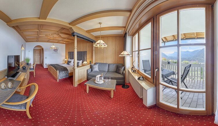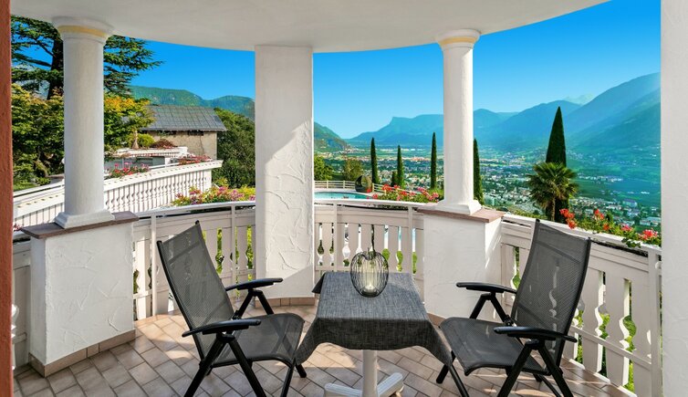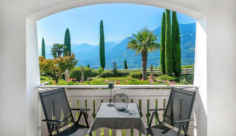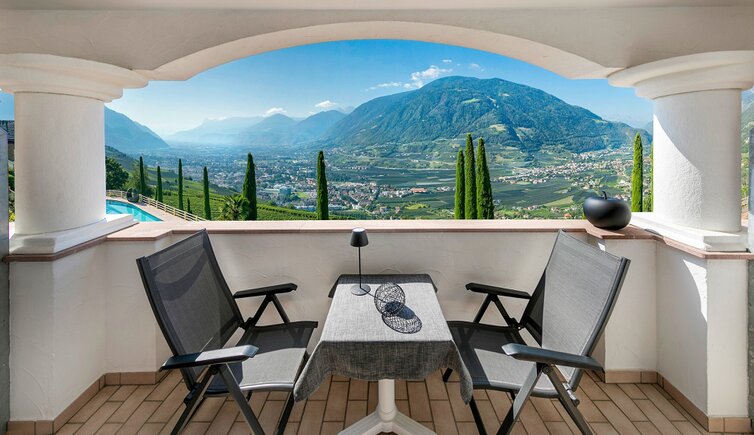 Auf der großen Panoramaterrasse erleben Sie einen einmaligen Ausblick auf das Meranerland.