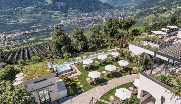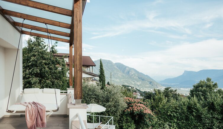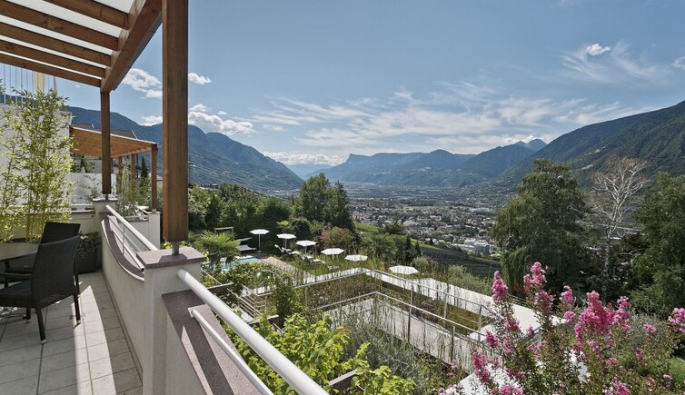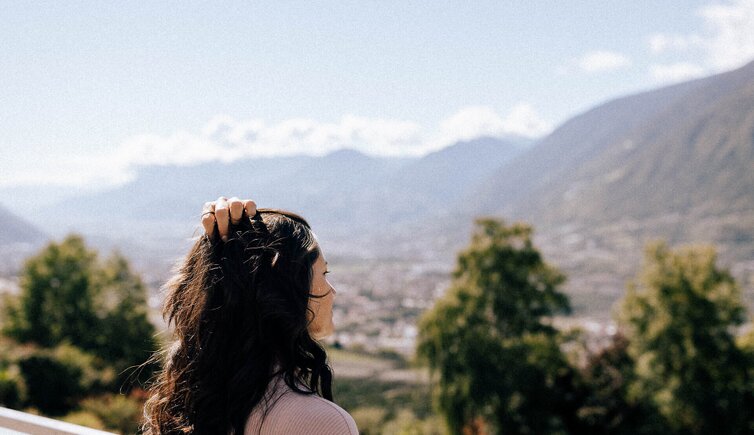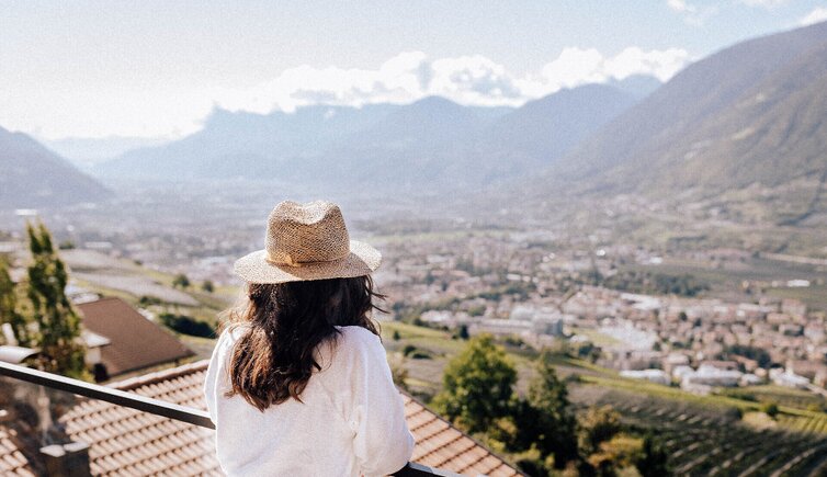 „Schau wie schön“ der Blick auf Meran und die Berge im Panoramahotel Am Sonnenhang.