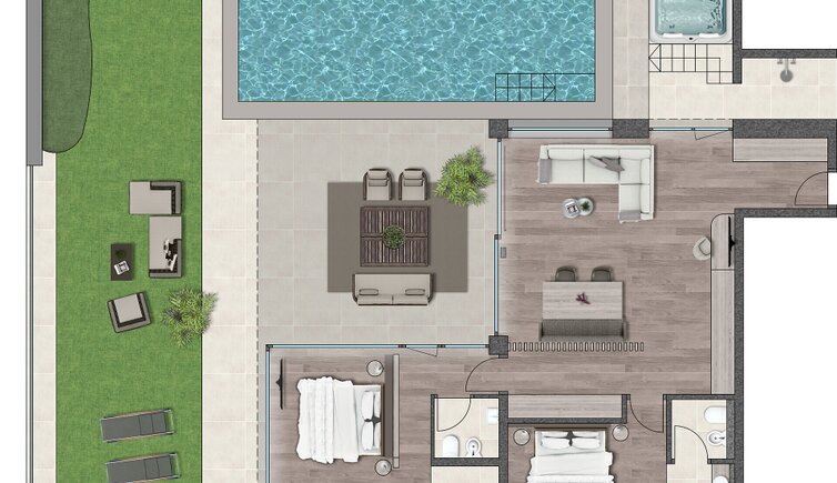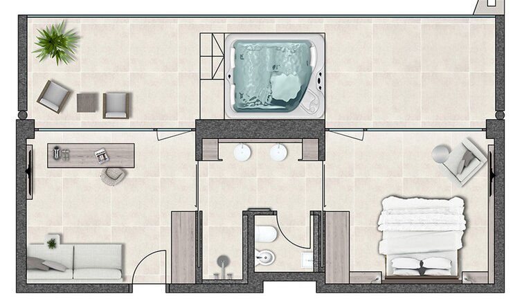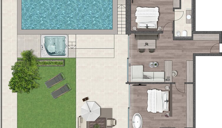 Besondere Highlights sind die Rooftop-Suite mit Private Pool sowie Suiten mit Sauna oder Whirlpool.