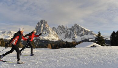 Genießen Sie 7 Tage auf Ihren Langauf-Skiern. 80 Kilometer Loipen mit traumhaften Panorama führen über die Seiser Alm. Ein wahres Paradies für Langläufer.