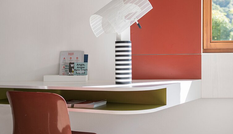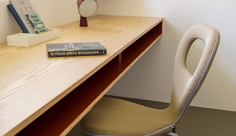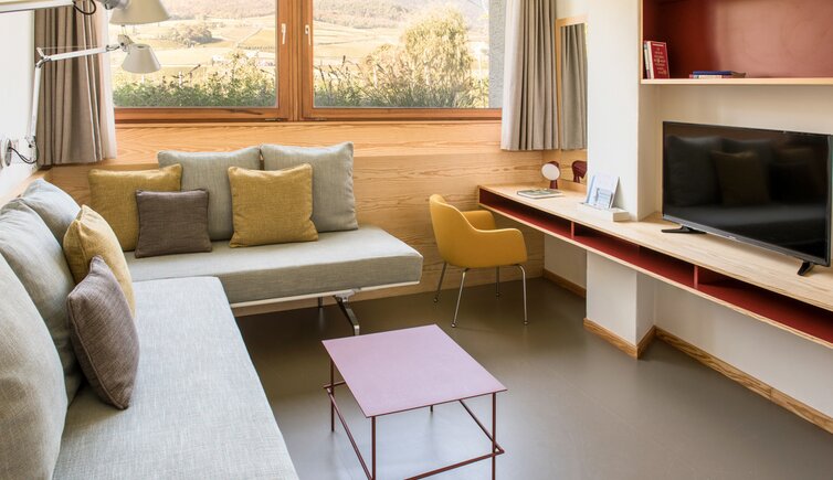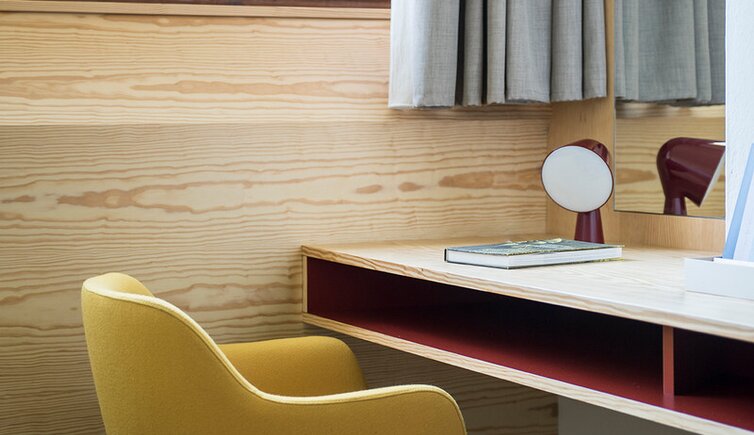 Der Baukörper des Hotels erinnert an ein Schiff im Hafen, eingebettet in natürlicher Landschaft. Das Außen spiegelt sich im Innenbereich in Form und Farbe wider: die Wasser- und Uferwelt, die Baumlandschaft und die Rebflächen.