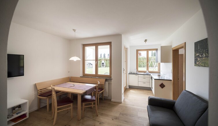 Die Wohnungen bieten ein heimeliges Urlaubszuhause. Auch die Genießerlounge mit Bibliothek und hofeigenen Produkten lädt zum Verweilen ein.