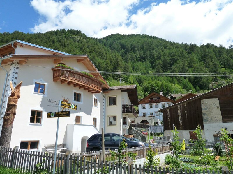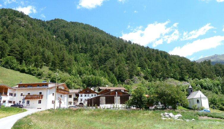 Ein paar hundert Meter die Straße entlang, und du stehst in Ulten, das meistens Ulten bei Mals genannt wird, um keine Verwechslung mit dem Ultental bei Lana aufkommen zu lassen. Auch Ulten besteht aus wenigen Häusern, einer Bushaltestelle und der St. Josef-Kapelle mit ihrem Pyramidendach aus dem Jahr 1719. Dazu kommt die Hofkäserei "aftmult".