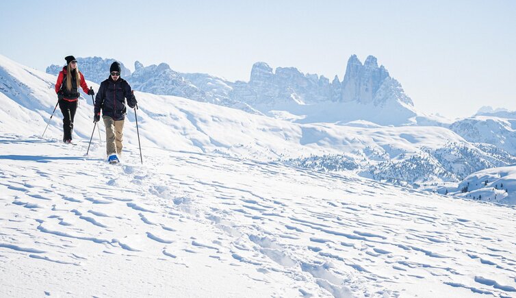 The hike begins on the picturesque Plätzwiese plateau – a wide alpine terrace with stunning mountain views in the Dolomites, a UNESCO World Heritage Site. In winter, the area transforms into a peaceful, snow-covered paradise. Depending on snow conditions, you hike with or without snowshoes along a well-marked trail to the Strudelkopf. From the summit at 2307 m, you’ll enjoy breathtaking views of the Three Peaks, Monte Cristallo, Hohe Gaisl and many other Dolomite peaks.