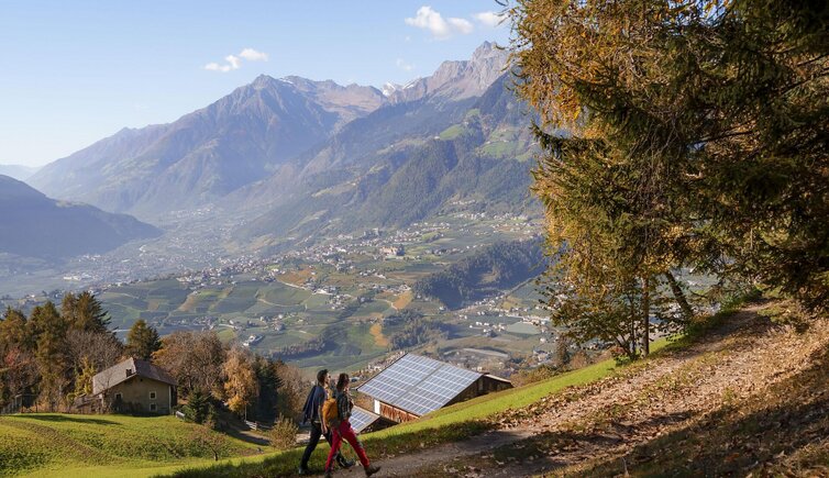 We take the bus from the village centre of Schenna up to the Pichler restaurant and then hike through the Vallplatz forest to the Bachlerhof farm and after a stop for refreshments we continue to Verdins. From the starting point you are free to decide whether to return on foot or by bus.
