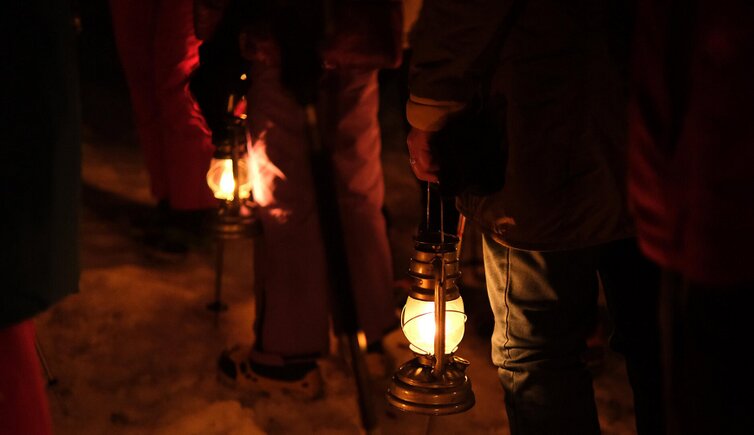 Romantic evening walk by lantern light with the magic of a campfire in Welsberg