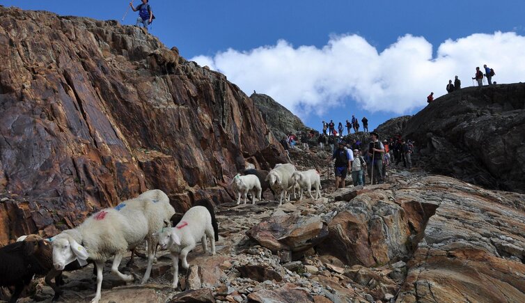 For centuries, each June shepherds have been driving their sheep from the Schnalstal Valley across the still snow-mantled saddles to graze in the pasturelands belonging to the farmers in Venter Valley in Austria. They return in mid September. About 1,500 sheep leave from the “Rofenberg-Alm“ in the early morning, reaching Hochjoch near the Bella Vista lodge (2845m) at about 11:30 a. m. The sheep arrive in Maso Corto between 3:00 p. m.