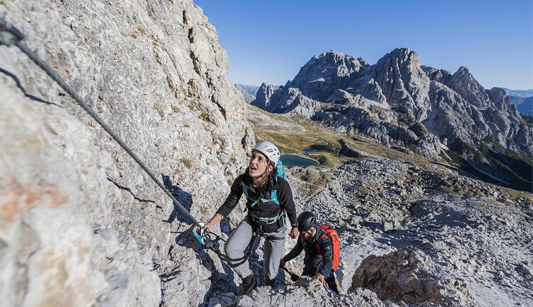 A 50-minute hike leads to the start of the via ferrata, during which you can already enjoy the stunning UNESCO Dolomite landscape. On the via ferrata, the mountain guide is happy to provide tips and tricks – the route is also perfect for beginners.