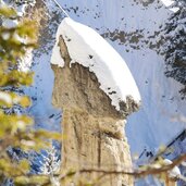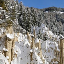 They were formed in a similar way: A few hundred years ago, a landslide blocked the cart track between the Thalerhof farm and the hamlet of Sopranessano. In the course of time, the Plata Earth Pyramids grew out of the stones and the clay underneath, and today they can be reached in 45 minutes on a pleasant hiking trail. The natural monument is also interesting in winter, when snow covers the stones and forms another protective cap.