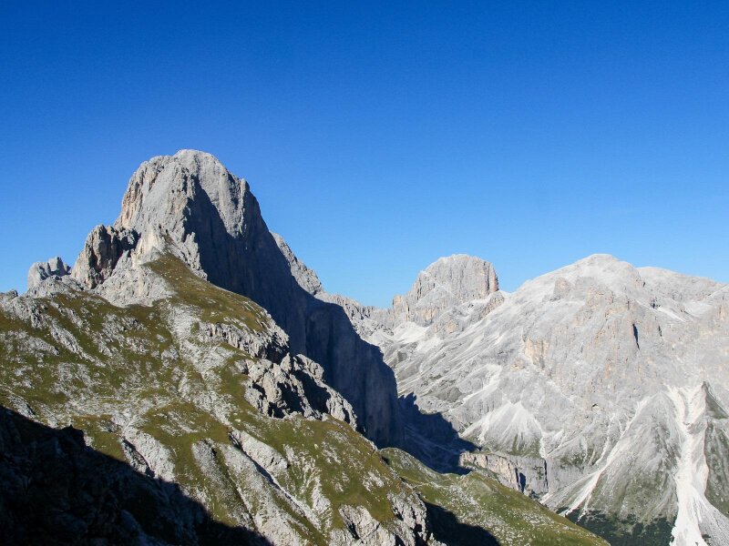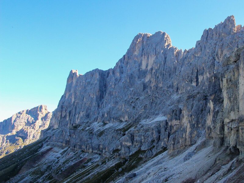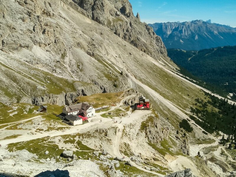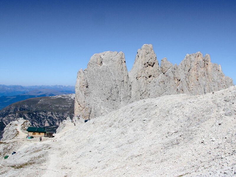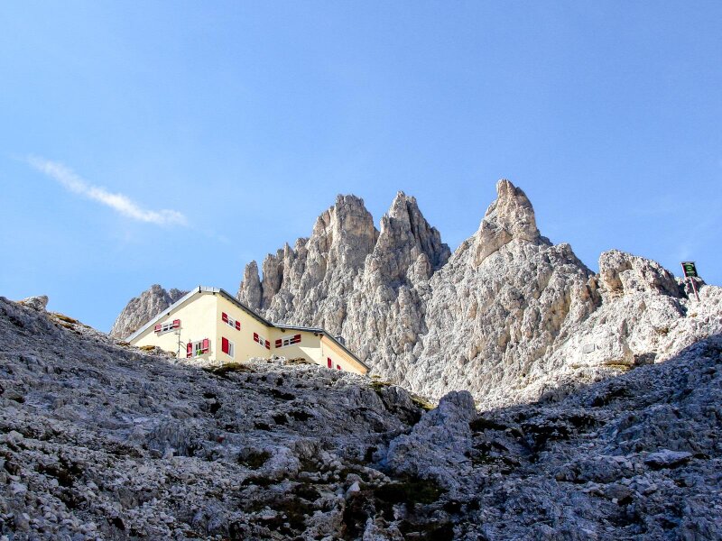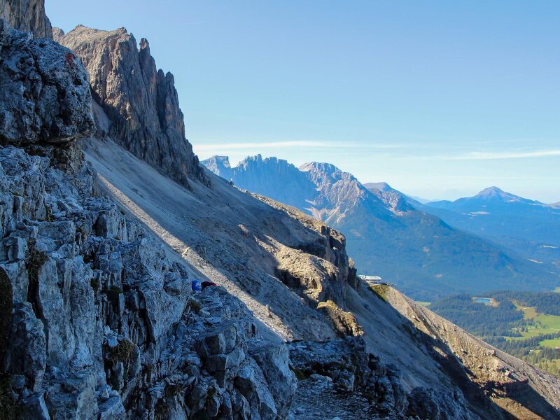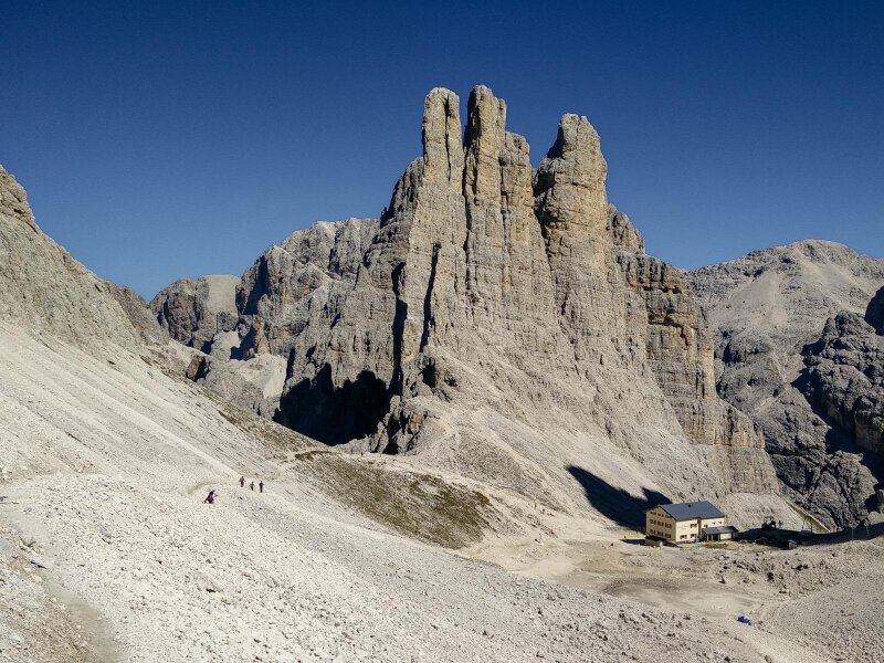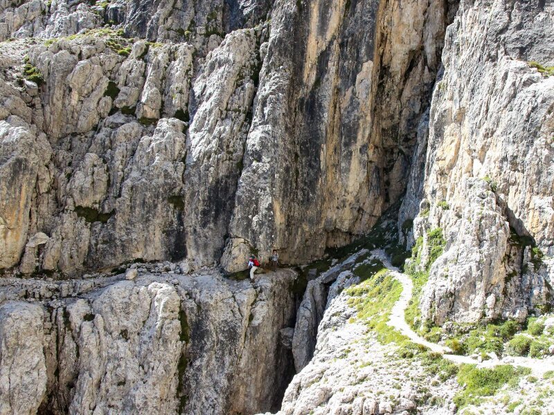 There are also small steps and safety fixtures there. These are missing on the rest of the route, so great care must be taken! Once at the Santner Pass, we descend to the Re Alberto Hut (Gartlhütte) in the Sciliar-Catinaccio Nature Park. The mountaineer Tita Piaz from the Val di Fassa acquired it in 1933 and named it after King Albert I of Belgium, for whom he had served as a mountain guide. The hut, at an altitude of 2,621 metres, provides a wonderful view of the mighty Vajolet Towers.
