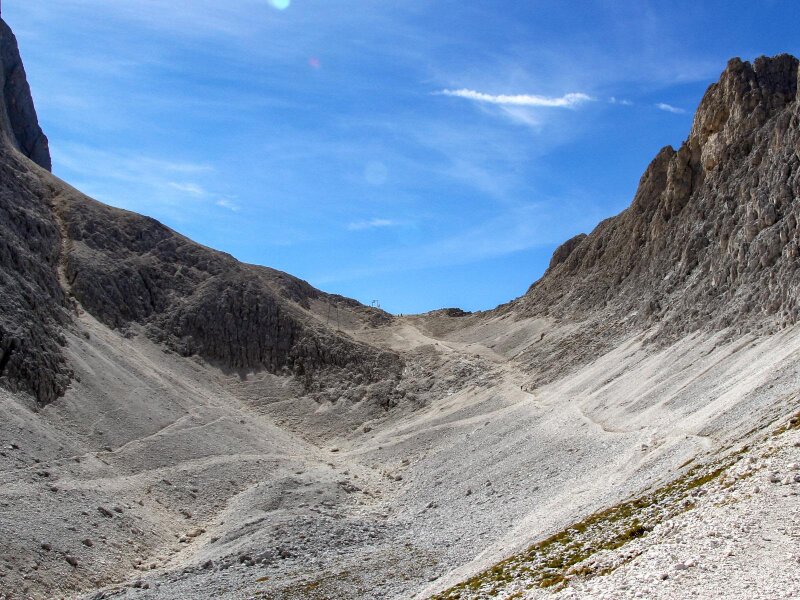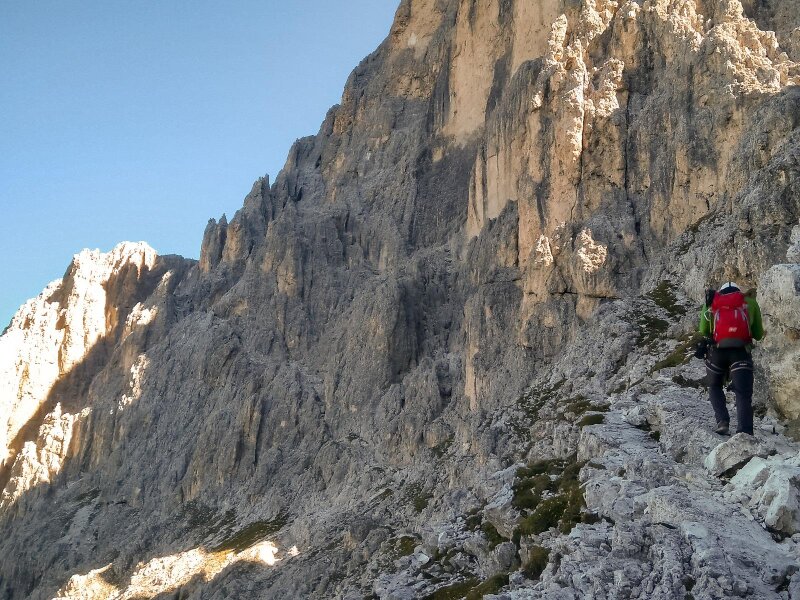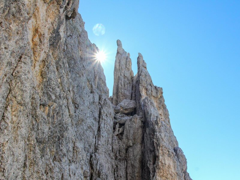 At the top station of the cable car, we follow the signs for the Santner Pass Via Ferrata, first turning left around the Rifugio Fronza alle Coronelle (Kölner Hütte, path no. 550), and then steeply uphill with fixed ropes. We walk north towards the steep rock faces of the Catinaccio. This is the legendary realm of King Laurin and his Rose Garden, which glows in brilliant shades of red and orange every evening at dusk. This Dolomite Glow is known here as Enrosadira, a Ladin name.