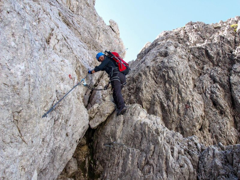 At the first fork, we keep left and stay on the easy path along the mountainside, always following the red markers (542 "S"). The start of the via ferrata is a steep ascent: With some effort, we reach the Santner Pass and its mountain hut. The route requires concentration, caution, and full via ferrata equipment - only the final section is secured with steel cables!